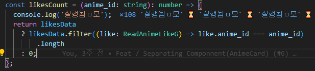 콘솔을 잘못 찍어서 한번만 찍히지만 실제론 filter 자체는 18번 돌고 있고, 여러번 호출되던 likesCount가 한번만 호출되게 되었다.